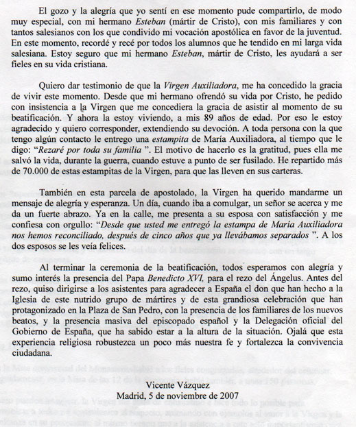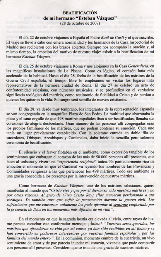 del Beato Esteban Vázquez Alonso a su hermano Vicente, días antes de su detención.