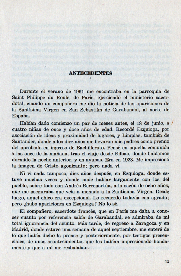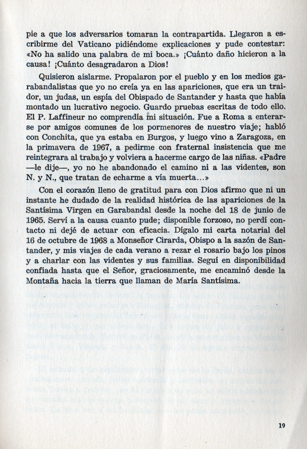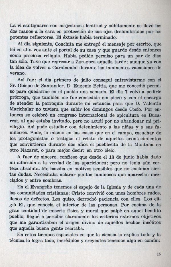 El Padre Luna relata como fue que se entero de las apariciones de Garabandal; La experiencia que tuvo en el pueblo la primera vez que subió y fue testigo del éxtasis de Conchita el día del segundo mensaje dado a través de San Miguel Arcángel. Cuenta las entrevistas con varios Obispos de Santander y relata cuando acompaño a Conchita y a su madre Aniceta al Vaticano (Roma) a entrevistarse con el Cardenal Ottaviani (por expreso pedido de éste: "con permiso del Sr. Obispo o sin él, tráiganme a las niñas"). El C. Ottaviani sirvió como secretario del Santo Oficio en la Curia Romana desde 1959 a 1966 en que ese dicasterio fue reorganizado como la Congregación para la Doctrina de la Fe, de la cual él era Pro-Prefecto hasta 1968.