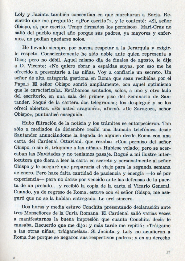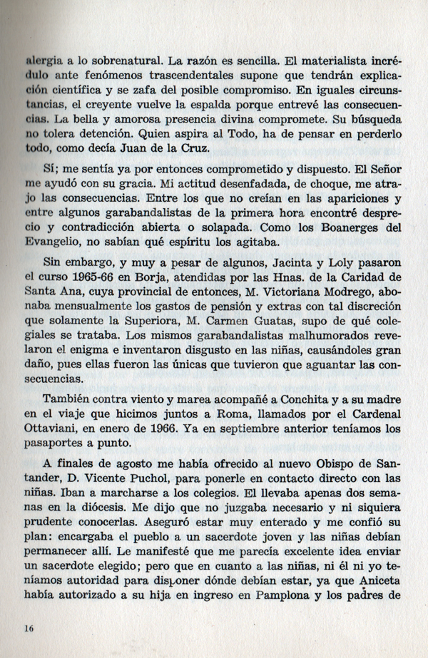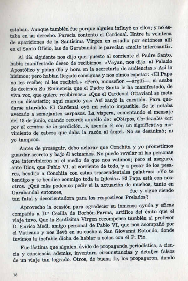 Luego relata el encuentro privado y las palabras de Bendición del Papa Pablo VI para Conchita (“Yo te bendigo y te bendice conmigo toda la Iglesia”) y la visita con Conchita al encuentro privado con el Padre Pío en San Giovanni Rotando.