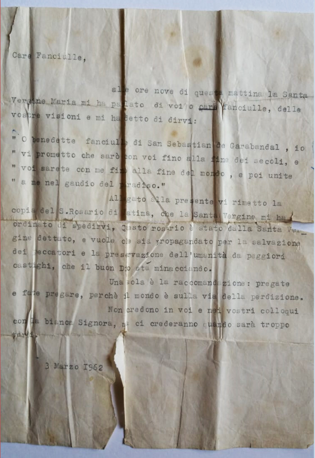 El 3 de marzo de 1962 las cuatro jóvenes videntes, Conchita, Mari Loli, Jacinta y Mari Cruz recibieron una carta anónima en San Sebastián de Garabandal. Este incidente fue reportado por el Dr. Celestino Ortiz, un incuestionable testigo, y sobre él hace un recuento el Padre Eusebio García de Pesquera en su libro "Se fue con prisas a la montaña"; de aquí tomamos el siguiente aparte: