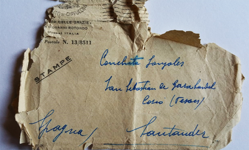Conchita: Recuerdo haber recibido en el correo una carta dirigida a mí y a las otras tres niñas, Jacinta, Loli y Mari Cruz. Me preguntaba qué contenía y, como no estaba firmada, la metí en el bolsillo hasta que ví a la Santísima Virgen ese día. Cuando se apareció le mostré la carta y le pregunté quién nos la había enviado. La Virgen dijo que era del Padre Pío. Como no sabía quien era el Padre Pío, no pregunté nada más. Después de la aparición conté a la gente sobre la carta; un seminarista que estaba presente me explicó acerca del Padre Pío y de dónde era él. Entonces le escribí una carta diciéndole que me gustaría verle cuando visitase mi país. El entonces me envió una pequeña carta diciendo: «¿Crees que puedo subir por la chimenea?» Yo sólo tenía 12 años en esa época y no sabía nada de los claustros.