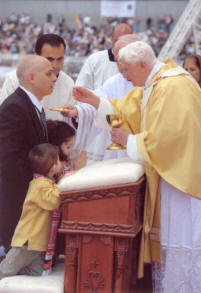 A partir de la solemnidad del Corpus Domini del 2008, y en continuidad con la enseñanza de su Predecesor, el Santo Padre Benedicto XVI comenzó a distribuir a los fieles el Cuerpo del Señor directamente sobre la lengua y estando arrodillados.